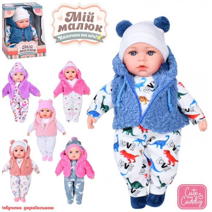 Чудовий пупсик висотою 39 см стане улюбленою іграшкою Вашої дитини. Пупси серії Мій малюк представлені в різному вбранні, тому ви зможете вибрати саме той, який більше сподобається. Озвучена іграшка українською мовою. Пупс дитячий вміє розповідати 3 казки. Має музикальні ефекти. Працює від батарейок.